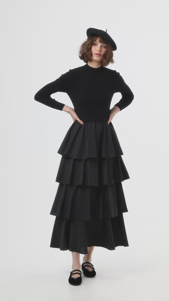 A sleek black long-sleeve fitted top seamlessly attached to a softly layered cotton skirt. This effortlessly chic dress combines structure and ease for a polished, all-in-one look.