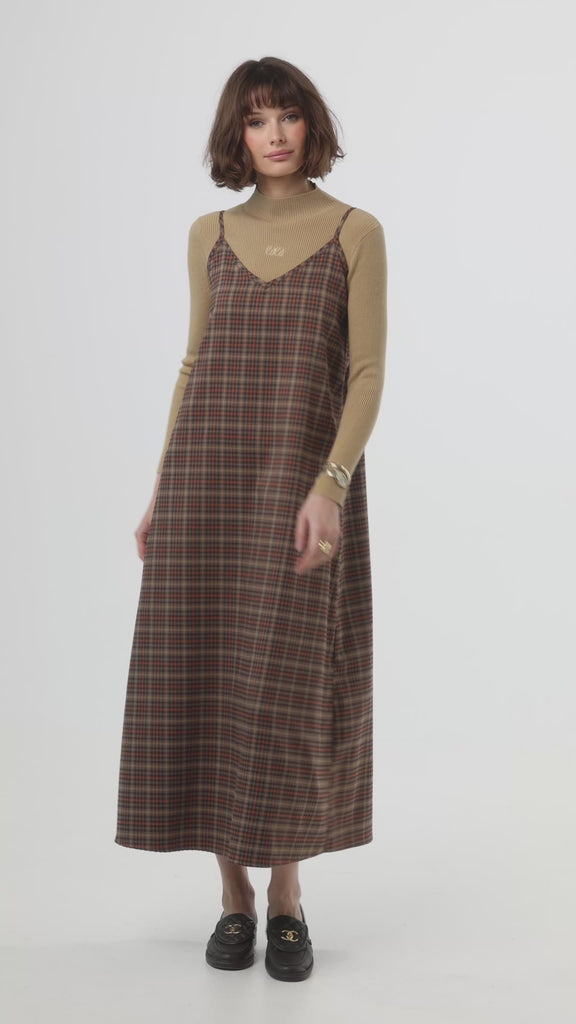 A sleeveless midi length plaid slip jumper made from lightweight, airy fabric that moves beautifully. Its easy, floaty design makes it perfect for effortless layering year-round.