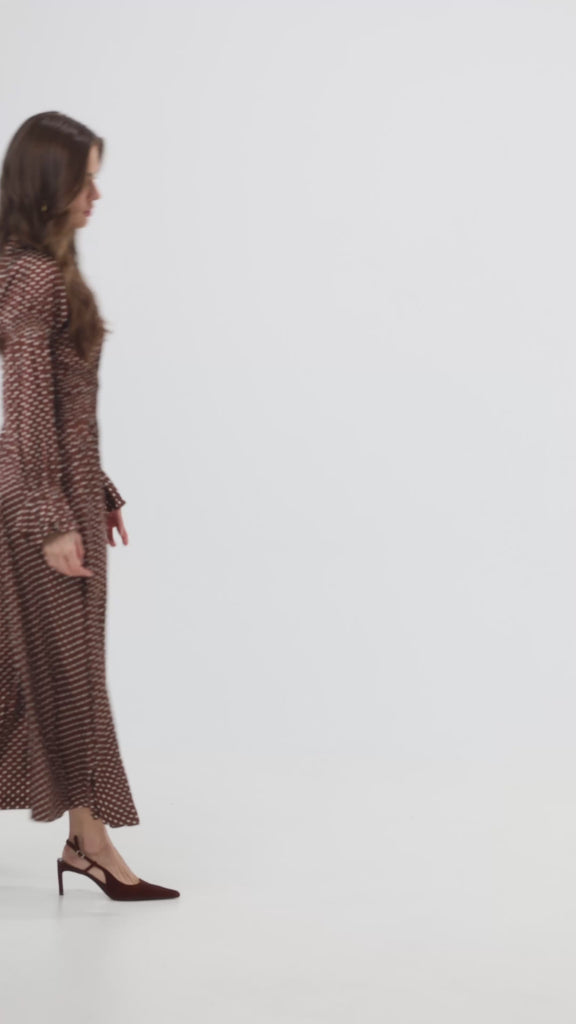 A brown satin-effect midi dress with cream polka dots, featuring ruched details at the waist and sleeves for a trendy, flattering fit. Effortlessly cool and comfortable, this elevated piece is perfect for easy, stylish dressing.