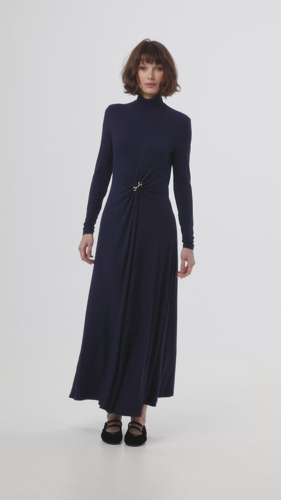 A soft cotton mock neck maxi robe dress featuring a horse bit buckle and knot detail at the waist for a flattering, cinched silhouette. Comfortable and effortlessly elegant, it’s a versatile piece perfect for any occasion.
